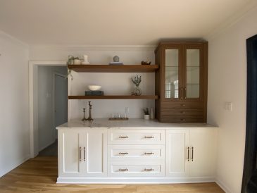 For this project, we started with a blank 13.5 foot wall and removed the existing baseboards. My client wanted a mix of storage, function, and beauty, including a tall cabinet on either end, counter-height cabinets with a countertop and a beverage fridge in the middle, with wood floating shelves hanging above.