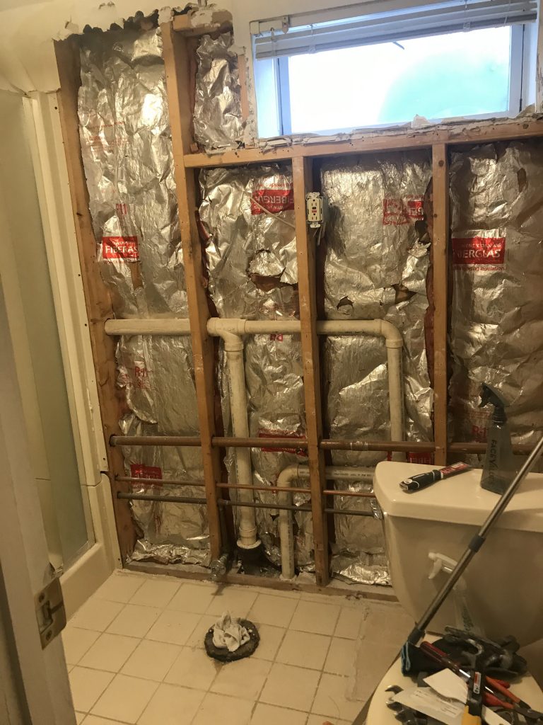 My original plan was to update this space cosmetically (…notice “original”) with a relatively low budget. The plan was to keep the vanity and update its doors, remove the wallpaper on the walls, paint the shower stall, and update the faucets, lighting, mirror, and decor. I know it may sound like a lot but it’s less than 40 square feet, and I wasn’t planning to do anything involving major plumbing or electric so I felt comfortable taking this on alone.