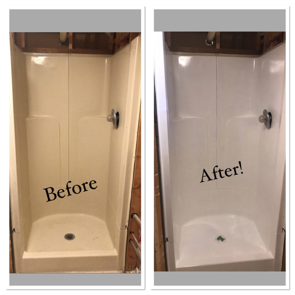 With the walls done, it was time to tackle the world’s smallest shower stall. For this, I decided to use Rustoleum’s Tub & Tile Refinishing kit in white. Before starting, I cleaned the stall really well with TSP and repaired a few chips with a two part epoxy. When it was time to start the refinishing, I followed the directions to a T, including opening all available windows, running the bathroom fan, and wearing a respirator…man that stuff is potent!! The shower required three coats (2 kits worth), with time in between to dry. Don’t be like me, and think one kit will do the trick and then wait for the 2nd kit to be delivered. Just buy the extra! You can most likely return whatever is unopened after your project.