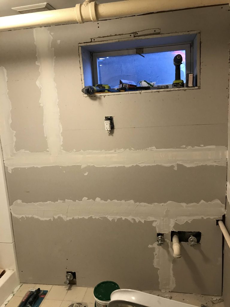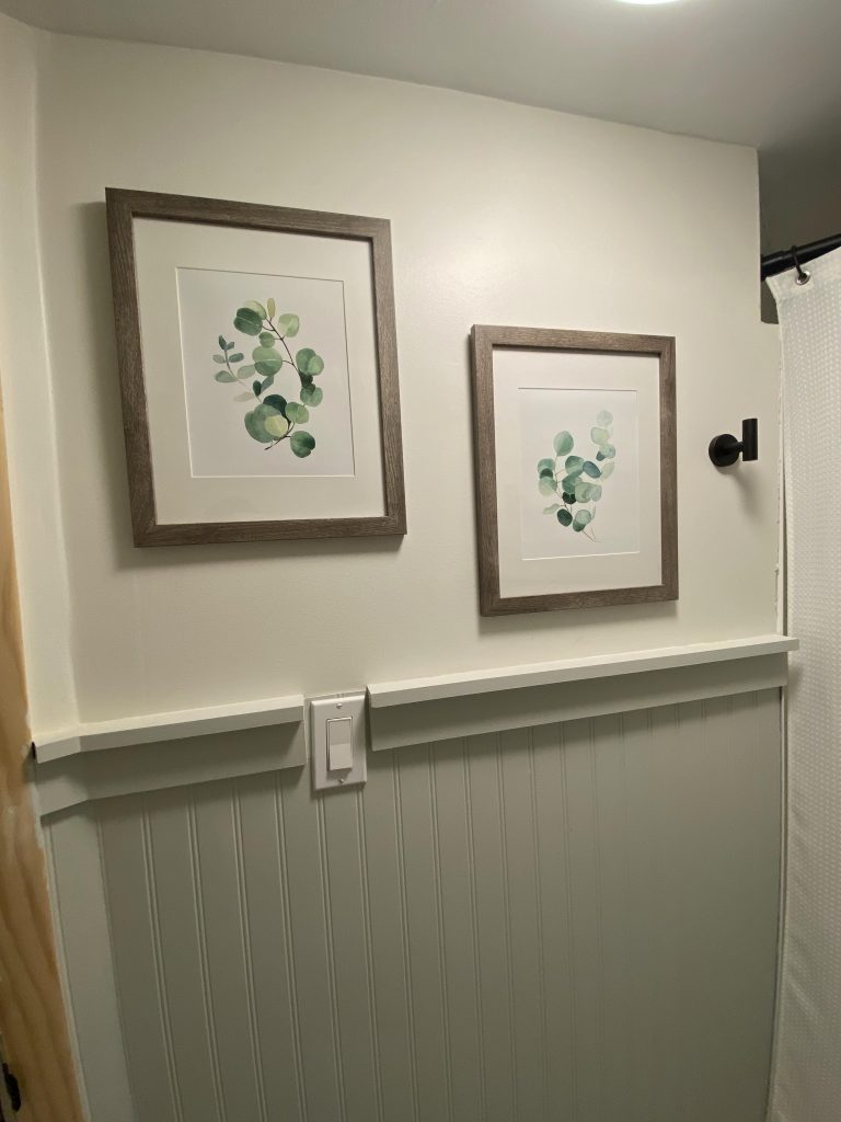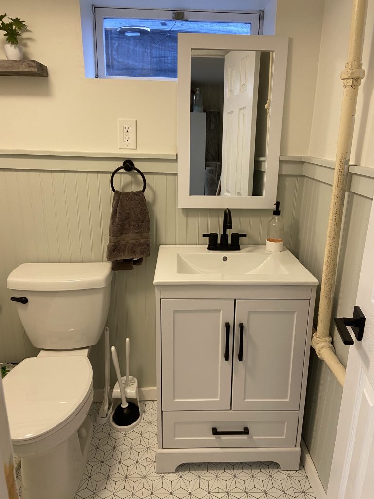 Finishing touches included a new ceiling light, a new mirror, a towel ring, a floating shelf, and some wall art! The window in this bathroom is not in the best place, and proved to make hanging the mirror difficult. And while it may not be the best or prettiest solution, it’s just fine for our basement bathroom. Our ceiling fan vent got a quick coat of white spray paint and a fresh white shower curtain finished up this space. This bathroom was a labor of love, and I learned a TON! Many firsts, including my first and hopefully last time sanding drywall! But in all seriousness, tackling this project gave me the confidence to embark on my DIY journey and to keep moving forward as I add skills and tools to my actual and metaphorical toolbox!