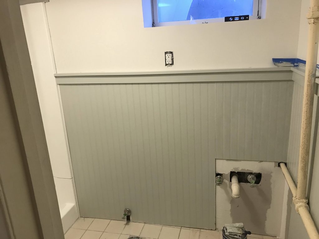 For several reasons, I chose to install beadboard on the bottom portion of the walls, only leaving the tops requiring mud, tape, sanding, etc. I chose a simple 1×3 trim for the baseboards and for the top of the beadboard, followed by a 1×2 to form a little ledge…aka dust collector! I caulked my seams (with paintable caulk!), and painted the beadboard and baseboards with Gray Owl by Benjamin Moore. After mudding and sanding the top portion, and mudding and sanding some more, I used drywall primer before applying two coats of Sherwin Williams Alabaster.