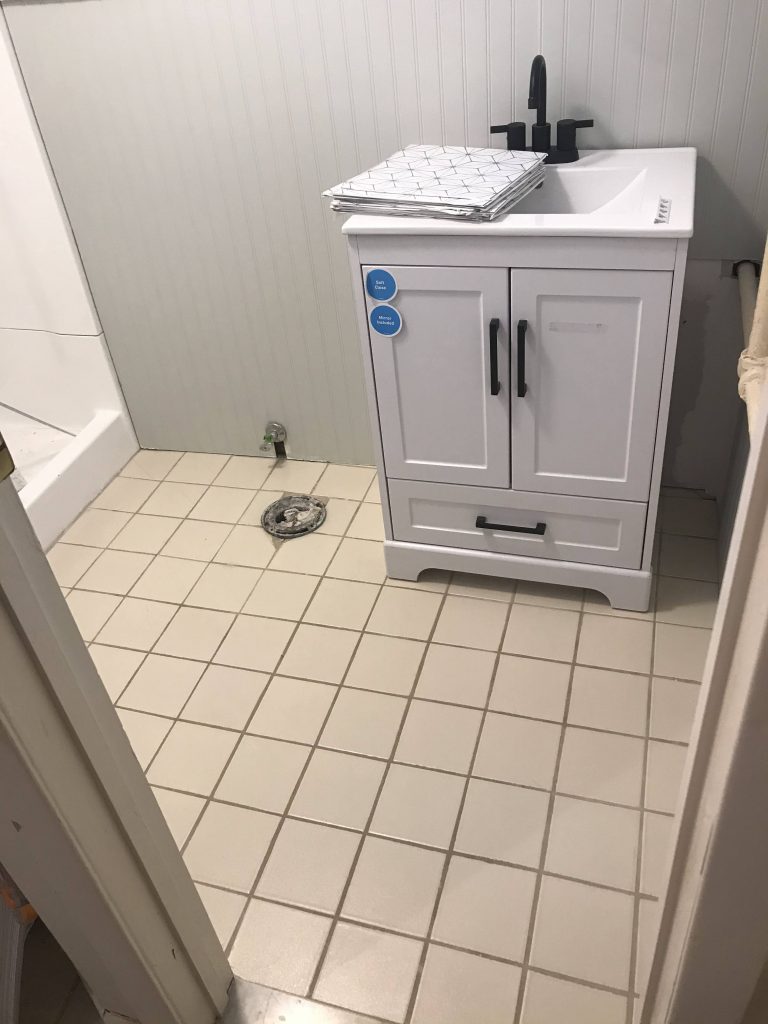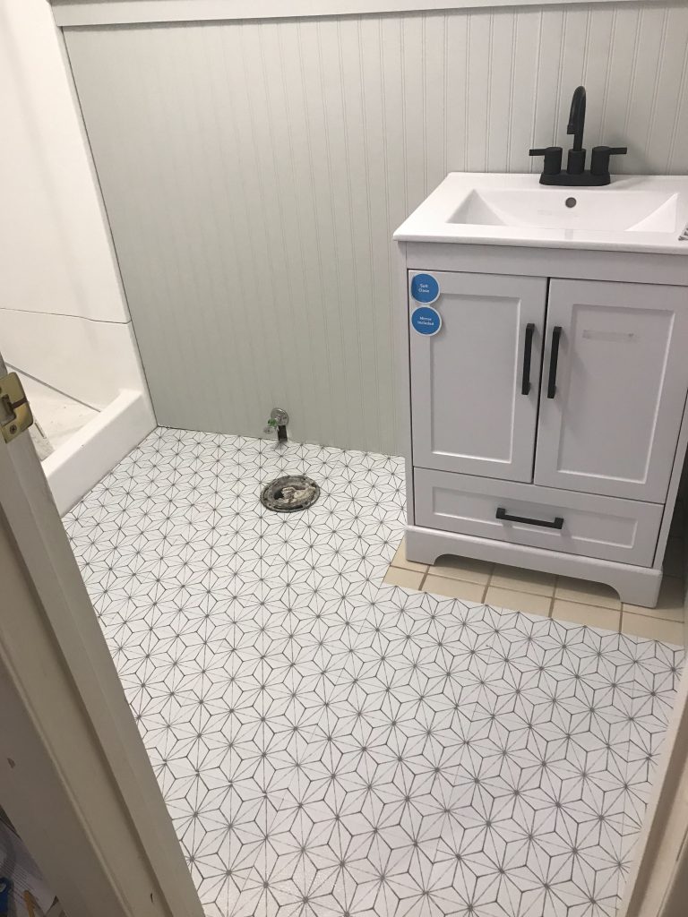 Are we done yet? Almost! The tile floor, while boring and old, was in perfect condition and we couldn’t justify ripping it up, nor did I want to. Our options were to paint it or cover it. We chose to cover it with a printed peel and stick tile. These were really easy to work with, and yet again, I didn’t buy enough and needed to wait after ordering more. Anyway, after cleaning the floor really well, the tiles went down relatively easy. I used my craft cutter when making longer, straight lines, and a regular scissor with other more intricate cuts. When the flooring was done, the 1×3 baseboards were attached, and the new vanity was ready to be installed.