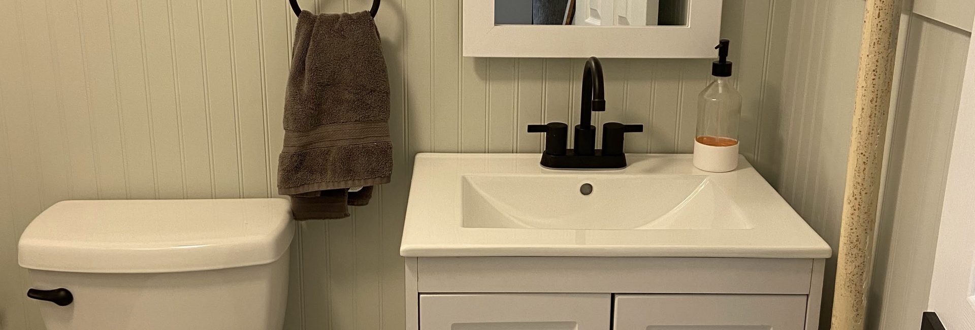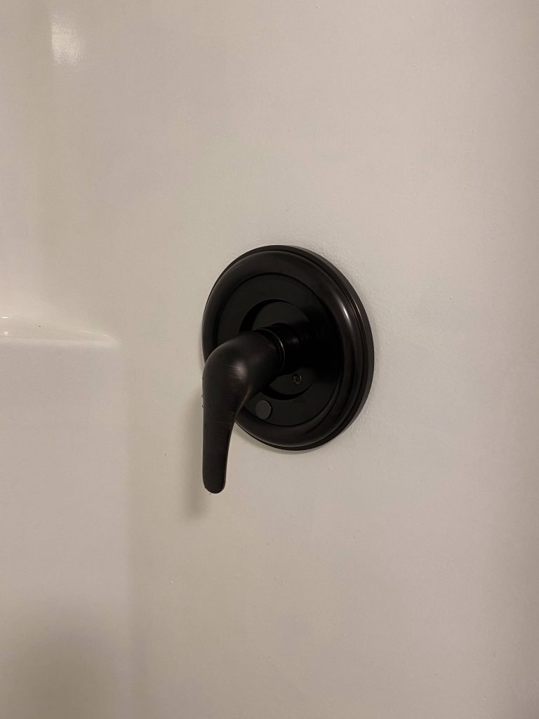 When it comes to plumbing and electric, I know my limitations but if it’s something I think I can figure out, I will try to do it myself. My thoughts are “If I’m going to call a professional, I might as well try it myself first!” Although I did get the vanity into place, attached the new faucet, and correctly installed a new P-trap, there was a small leak I just couldn’t figure out, and a plumber came out to finish the last 5% of this install. We decided to go with black fixtures in this bathroom, so I also installed a new black shower head and shower trim kit. (I actually think it was antique bronze because it was cheaper and looked black!) Fun fact: shower kits typically require you to know which brand valve you have because each brand requires a specific kit to fit correctly. I ended up getting lucky with a universal trim kit and was able to successfully install it myself! I don’t think I was ever as excited about a shower handle!