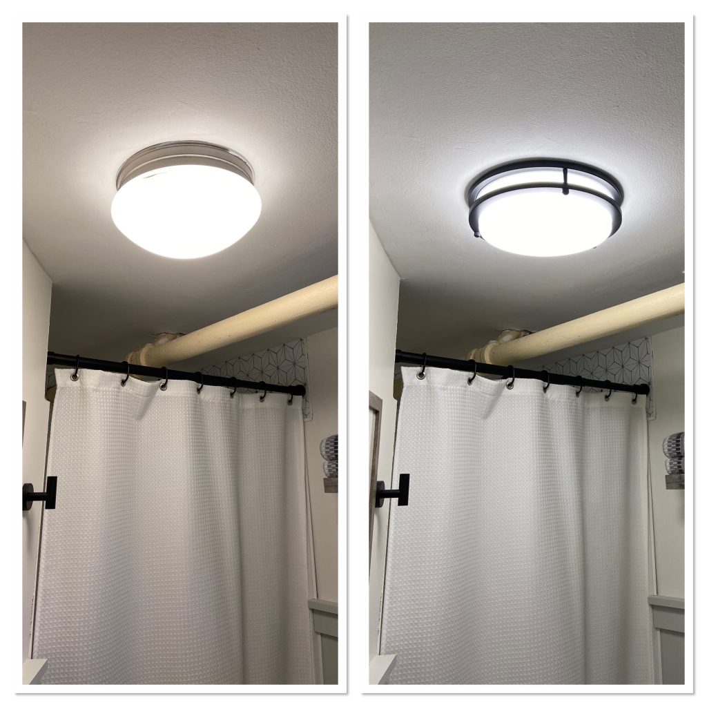 If you’ve ever researched black fixtures, you probably realized how much more expensive black is than chrome or nickel. I was not about to pay double for a black toilet flusher but also couldn’t leave the chrome while everything else was black. So, out came my trusted Rustoleum Spray Paint & Primer in one! I keep a full can of this on hand and should probably buy stock in Rustoleum. Nothing in my house is safe! haha