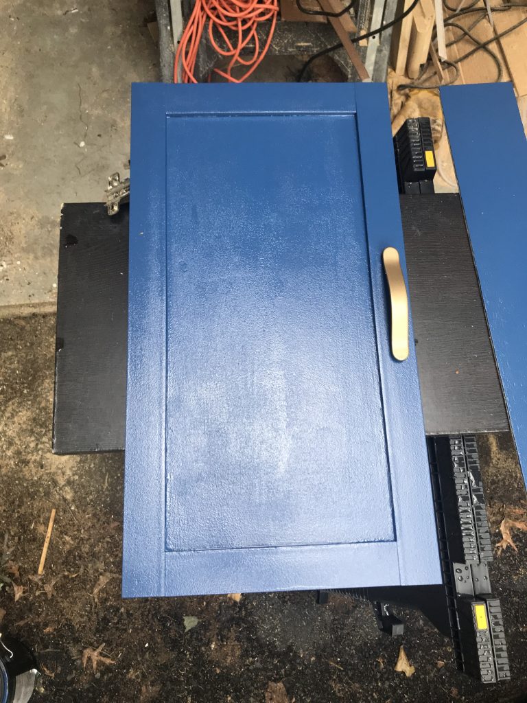 First up was updating the vanity doors. I figured if I started with a simple project, I’d gain momentum, build some confidence, and be ready for the following projects! My goal was to use trim and paint to transform them into a modern navy, shaker door, and to use gold spray paint on the existing hardware (if spray paint can fix it, you better believe I’m using it!). I ended up using PVC lattice trim from Home Depot to create the rails and stiles. This is a great beginner project because you can use miter shears and adhesive to attach them! No fancy tools needed. However, I attached them using my 18-gauge Ryobi brad nailer, then filled the holes with my favorite wood filler and sanded any excess wood filler once it was dry. I used Behr paint in the color “Velvet Rope” and while the blue paint doesn’t look navy in the picture, it was!