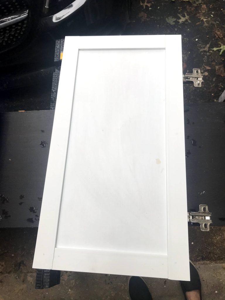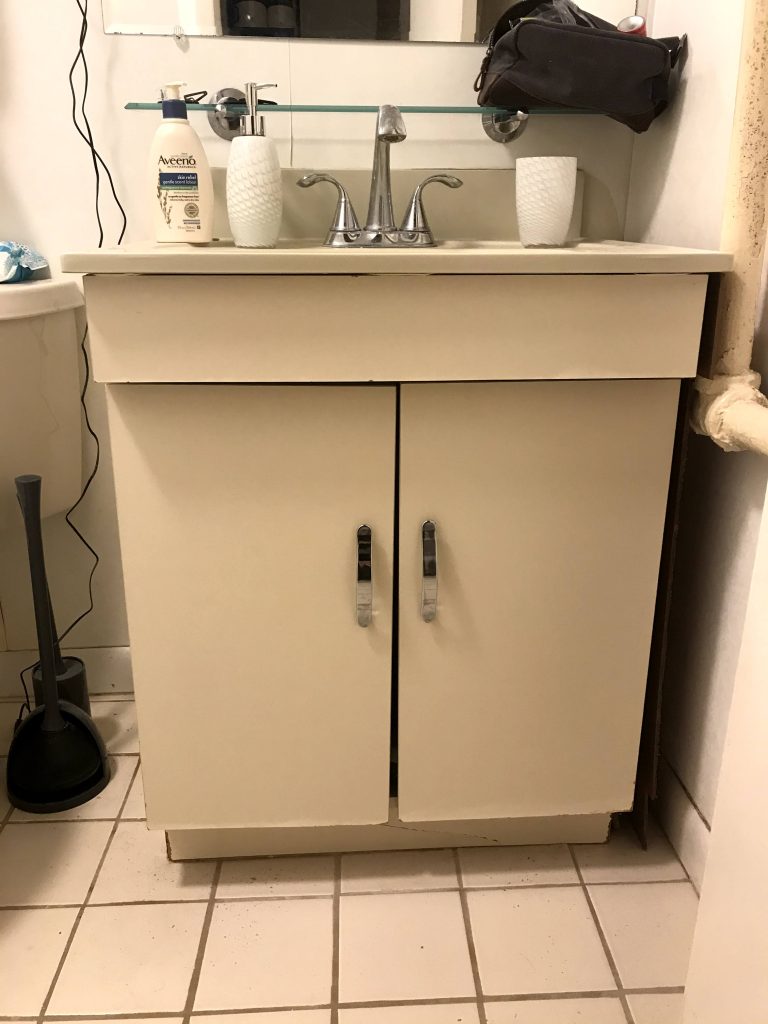 Next up was to spray paint the hardware gold and drill new holes through the PVC trim. I used Rust-Oleum Metallic in Bronze, and did two coats. Since I covered the original front holes with trim, I used the holes on the back of the doors as a guide when drilling new holes. Easy peasy. After attaching the newly updated hardware, I needed to update the vanity itself, and here’s where I ran into the first issue…MOLD. UGH! We ended up finding mold on the vanity and obviously decided to buy a new one. And so the “scope creep” begins.
